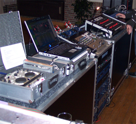 Onze muziekinstallatie bestaat uit een dubbele cd-speler, mengpaneel, effectmachine, minidiscspeler, 1 draadloze microfoon, 3 microfoons (met kabel voor redelijk grote afstanden) 4 versterkers en 8 speakers met een totaal vermogen van 2000 Watt!